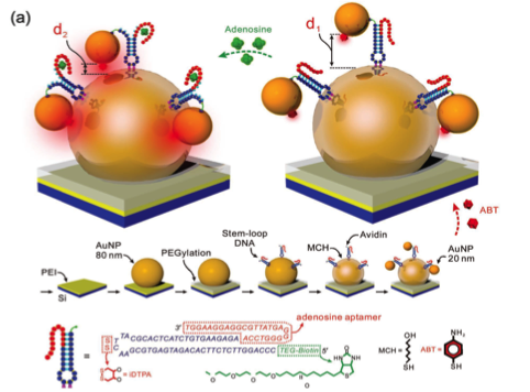 SERS is also a plasmonic phenomenon. The excitation of plasmons concentrate electromagnetic radiation in nanometer-sized volumes – so-called hot spots. Molecules located in such hot spots can produce enormously enhanced spectra. Collaborating with colleagues in engineering, and especially the group of Professor Carl Meinhart, we pursue a number of research avenues often by combining microfluidics with SERS spectroscopy. For example, we have created very bright nanotags that can contain a peptide or an aptamer that can interact either with an analyte or the surface of a cell. The very bright SERS spectrum of the nanotag is then used to pick out, for example, cancer cells from among non-cancerous cells flowing in the microfluidic stream; or to detect and identify small analyte molecules at very low concentrations entering the microfluidic stream from the ambient atmosphere.